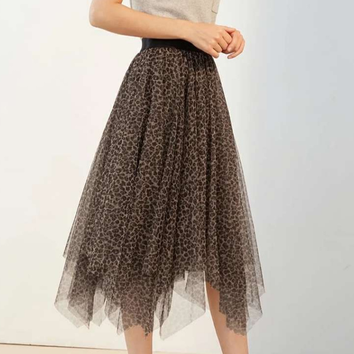 繊細な生地に施されたヒョウ柄プリントが、都会的で洗練された雰囲気を醸し出します。